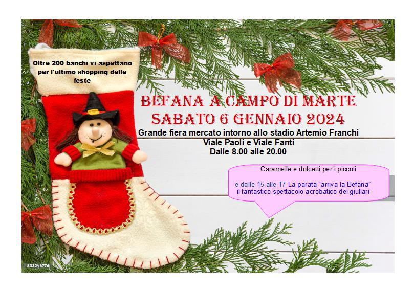 Grande fiera mercato intorno allo stadio Artemio Franchi. E dalle 15 alle 17 "arriva la befana", il fantastico spettacolo acrobatico dei giullari
