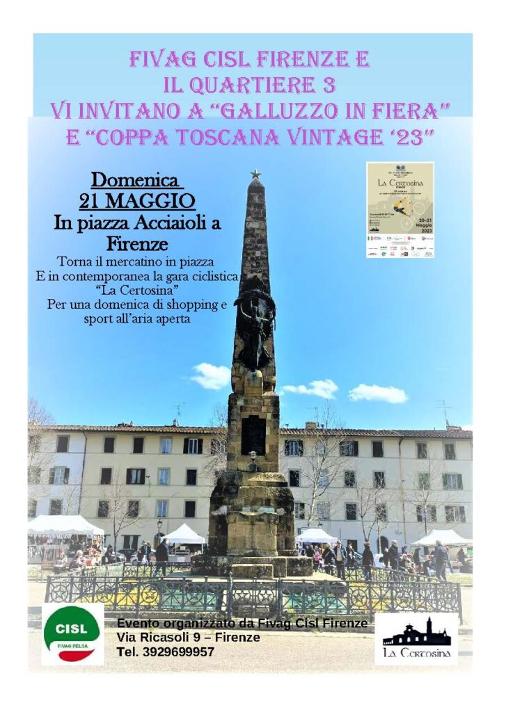 Domenica 21 maggio in Piazza Acciaioli a Firenze torna il mercatino in piazza ed in contemporanea la gara ciclistica “La Certosina”.