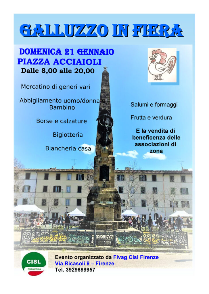Appuntamento domenica 21 gennaio dalle 8 alle 20 con Galluzzo in Fiera in Piazza degli Acciaioli. Presenti come sempre le varie associazioni di zona per la vendita di beneficenza.